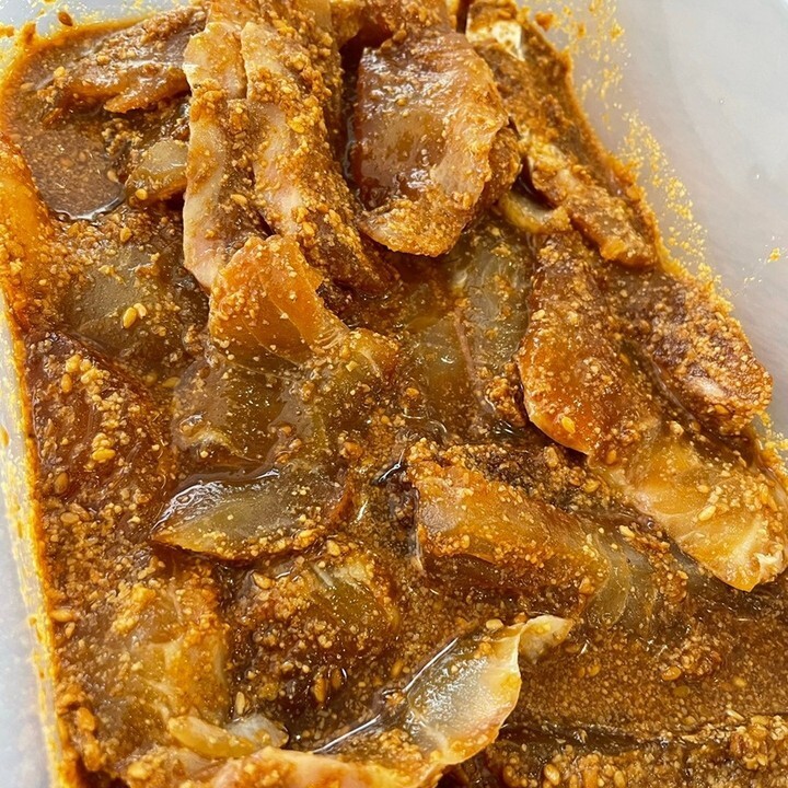 すりおろした金ゴマと、醤油、味醂、お酒の合わせだれに漬け込んでください☺