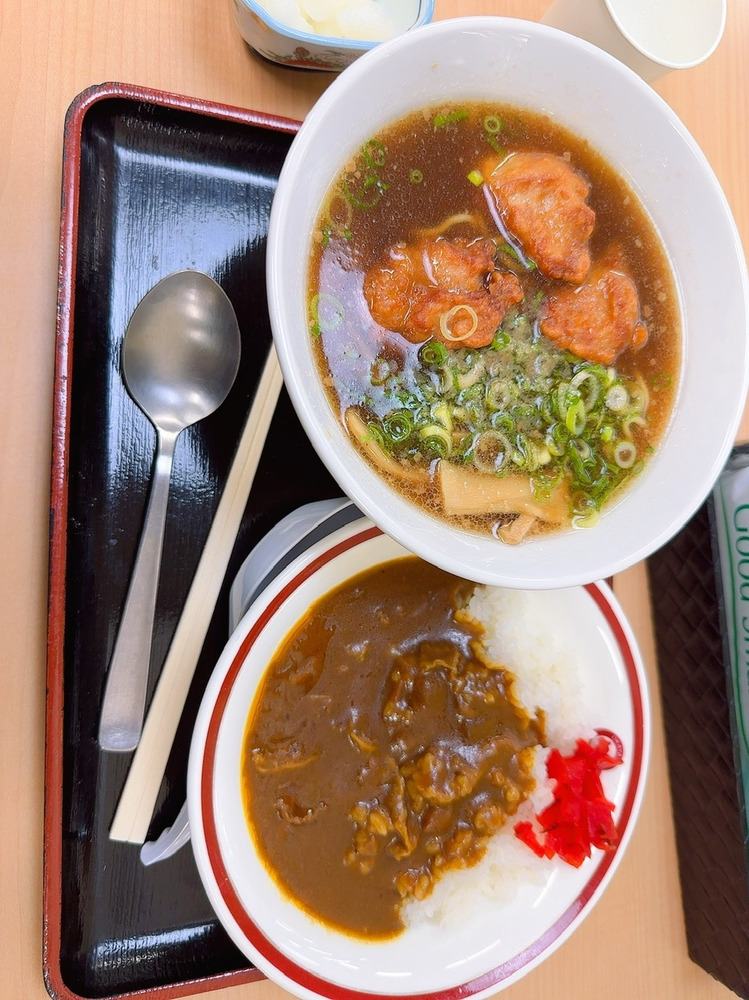 帰りのサービスエリアで昼食をとったのですが、券売機に【唐揚げラーメン定食】と書かれてあって、想像ではラーメン🍜と唐揚げ🍗とご飯🍚がついていると思ったのですが、まさかの内容🍜🍛で驚きました🫣お腹いっぱいでした🐸