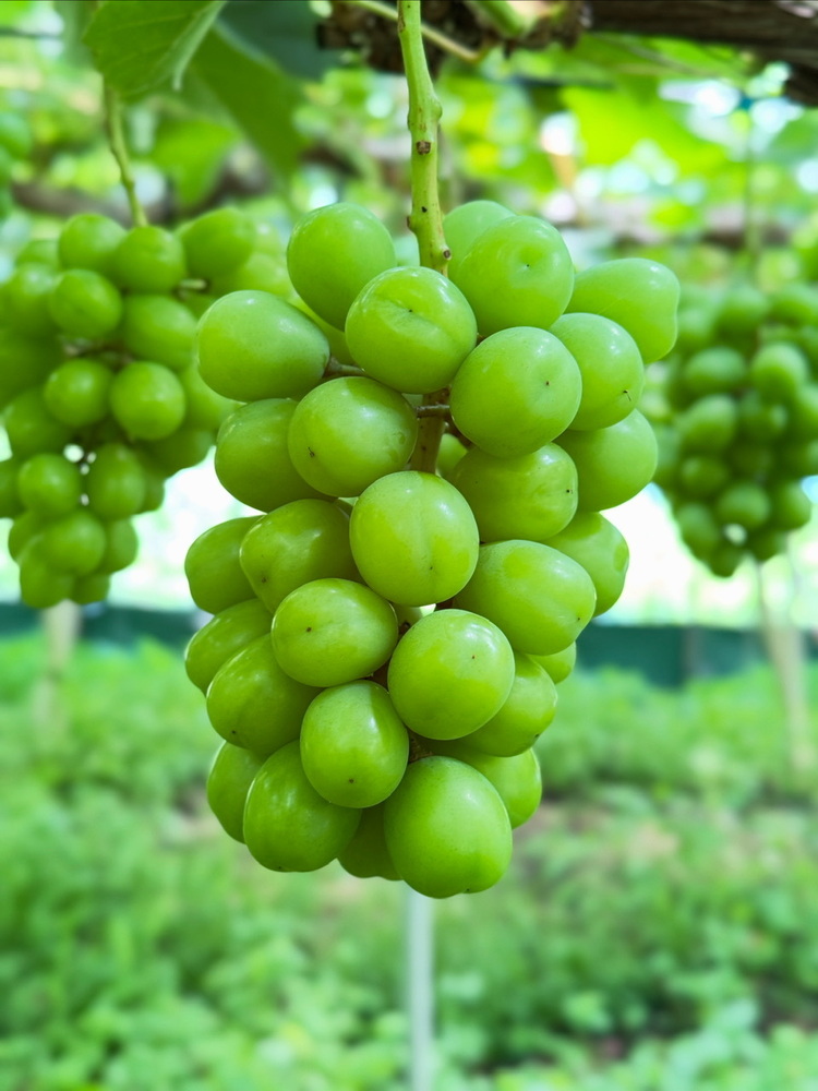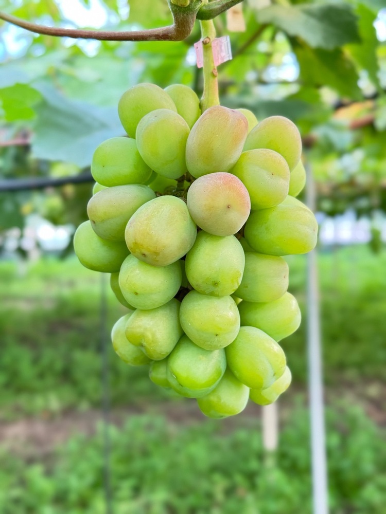 異常な暑さですが葡萄は暑さに負けず、すくすくと育っておりシャインマスカットと富士の輝(着色葡萄)は只今、このようになっております😋