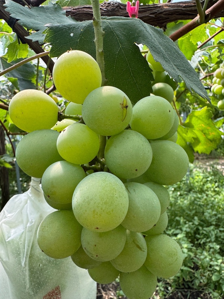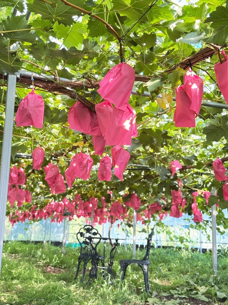 一方、シャインマスカットには糖度アップが期待できるピンクの袋を使用しています🛍️