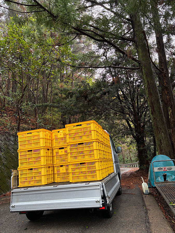 雨の日にコンテナいっぱいの文旦を運ぶ。なかなかハードだけど、