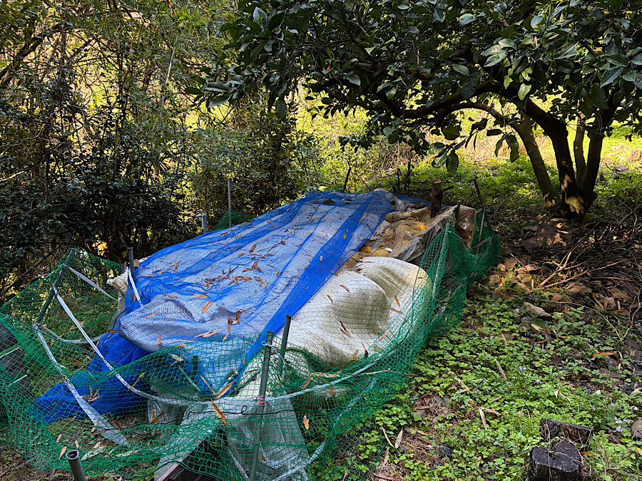 ネットは押し倒されて、ブルーシートもめくれて、中の文旦が顔を出してる…。