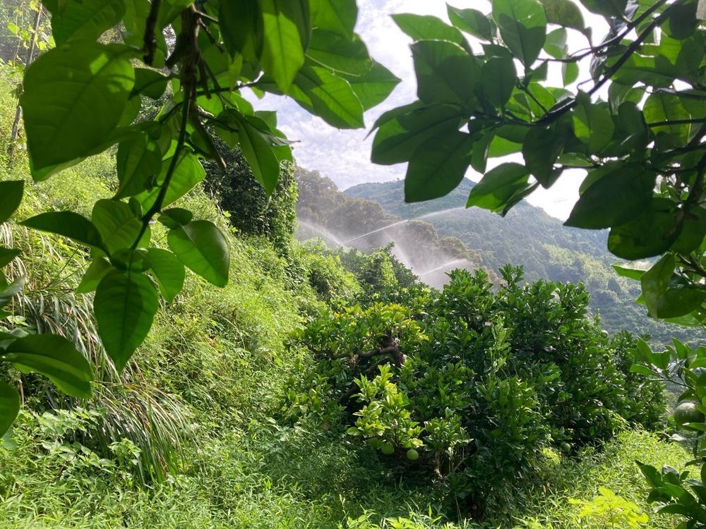なので、今日、散水機械を使って、文旦畑に雨を降らしています。