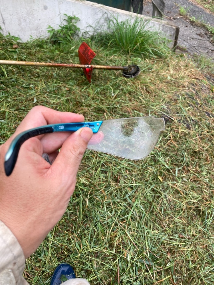 草刈りをしてたから、保護メガネをしてたんだけど、「あれ、雨!?」と思って、勢いよくメガネを外したら、勢いよすぎて、