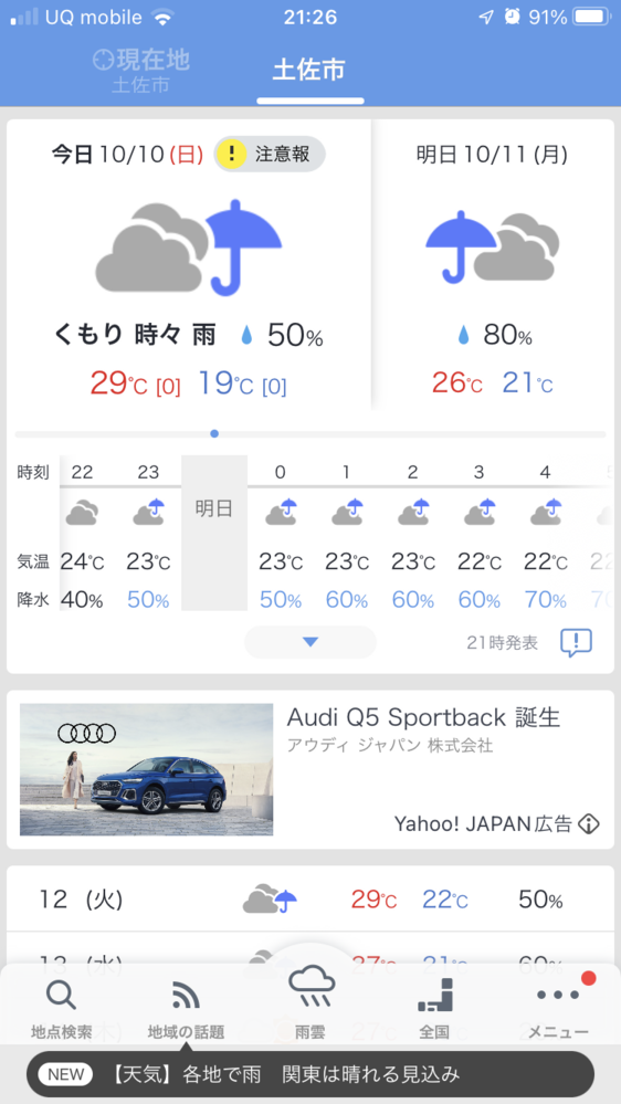 雨雲レーダーでは、22時くらいに降る予定だったのに、今みたら、朝の2時に降る予報になってる。