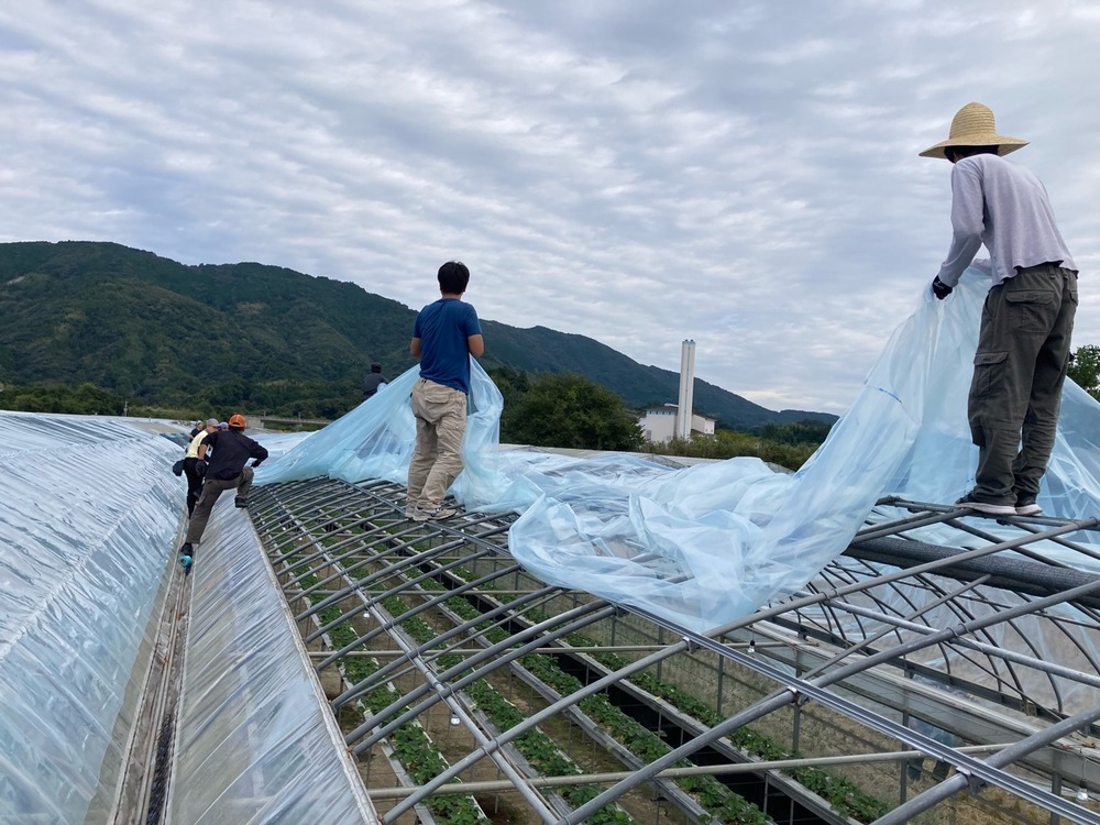 ビニールハウスの上に登って、ビニールを張り替えるのは慣れてないから、落ちないように気をつけながらの作業でした。
