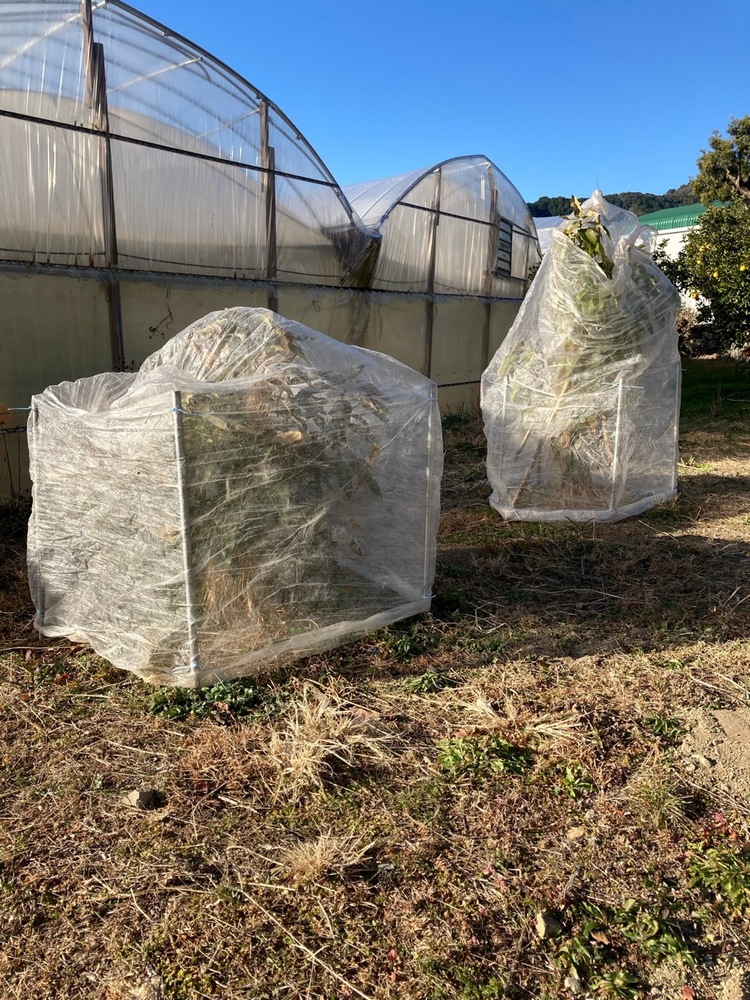 冬に野菜作りをするときに使う不織布。通称「パオパオ」で囲ってあげました。