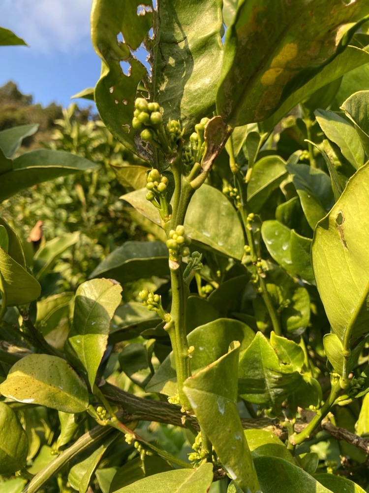 文旦の収穫量は、花が咲かないことには始まらない。花が咲いて実がなるので。