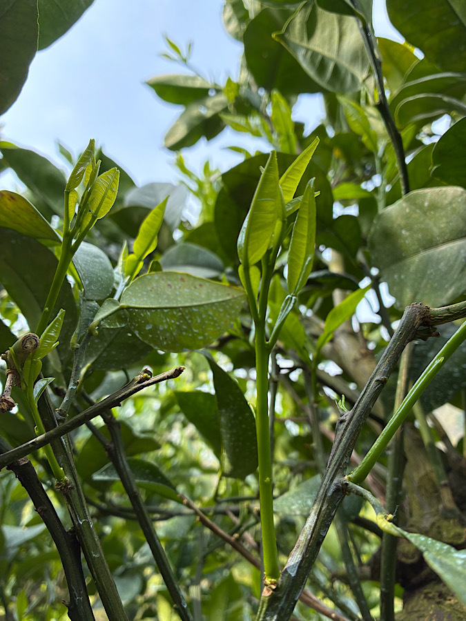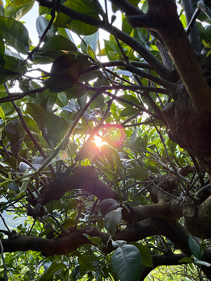 今日も朝からせっせと文旦の木の剪定に励みました。気がつけば、葉の間から夕日がちらり。太陽が西の山に隠れ始めていて、「えっ、もうこんな時間!?」と軽く衝撃。1日って本当にあっという間ですね。(o´д`o)=3