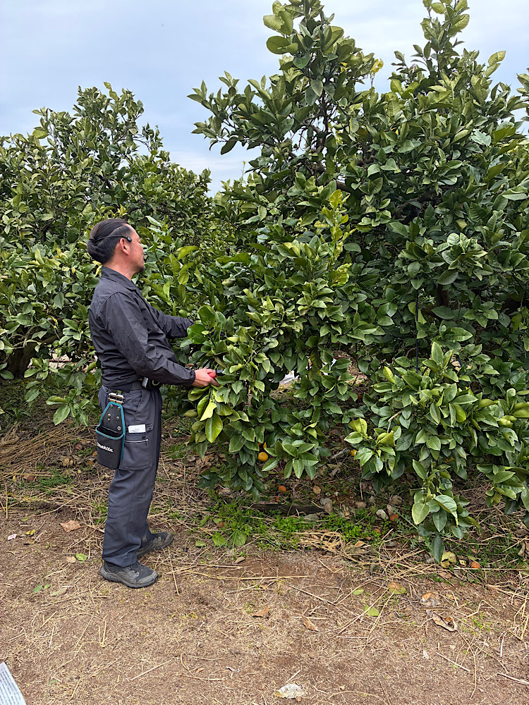 剪定講習会なんて、文旦農家になりたての頃は毎年参加してたけど、もう13年目。「ある程度わかるし、もういいかな?」なんて思ってたんです。でも今回は、今年、農林水産大臣賞を受賞した池さんの畑で、池さん本人が剪定を教えてくれるってことで、「農林大臣賞を狙うなら、やっぱ受賞者の話を聞かなきゃ!」と思って参加。