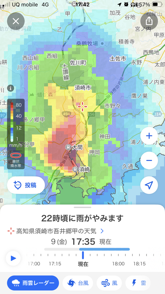 と思って、雨雲レーダーを確認したら、隣の須崎市と戸波地区までしか雨雲が来てない!