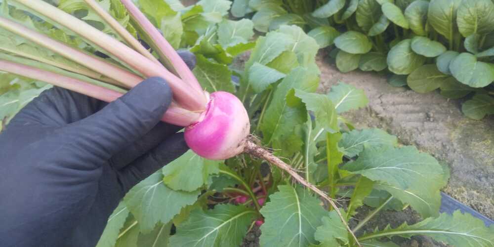 少量試験栽培していた武蔵野交配小カブ『桃寿』が肥大し、色が鮮やかになってきました。