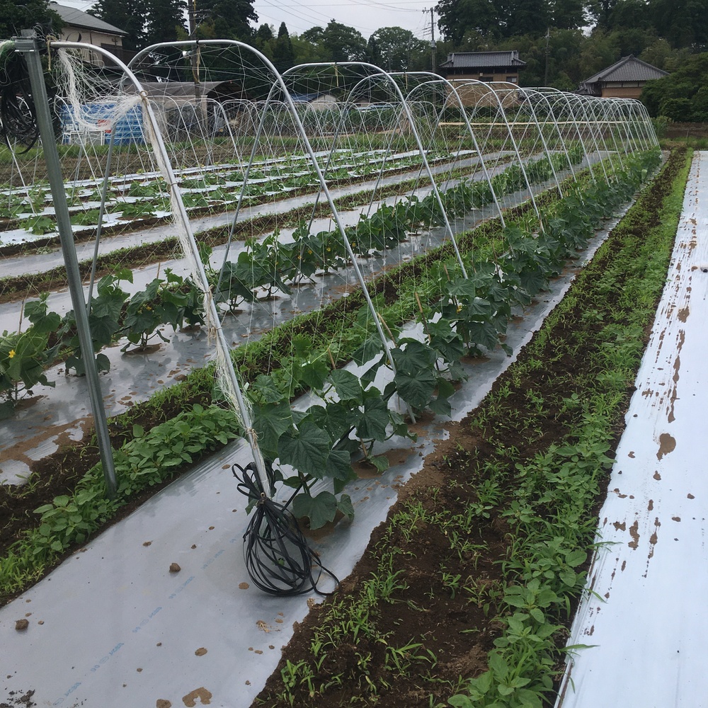 ミニトマト、ナス、キュウリです。茎から新しい芽が次々と出てきますが、早く成長させるためにそれを定期的に摘み取ります。それと茎が折れないように支柱やネットにテープで留めてやります。収穫まであと半月からひと月くらいかな。