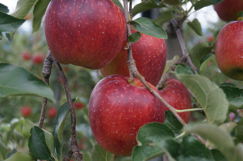 信州秋のリンゴ秋映は暗赤色になってきて収穫時期を迎えました。