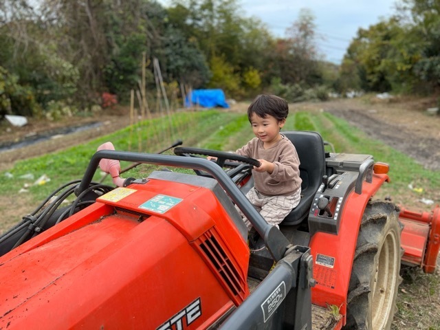運搬車にのせて畑まで移動し、スコップでひたすら撒きます!