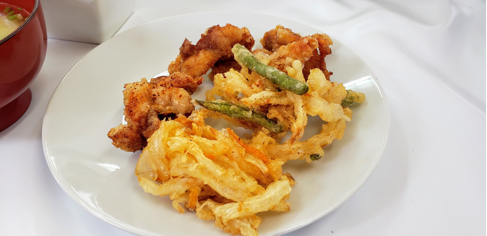 今日のお昼ご飯は農場で収穫したインゲン豆・タマネギを使ったかき揚げさんとキュウリの和え物です(*^_^*)