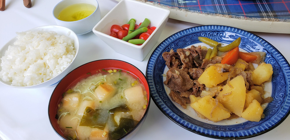 今日のお昼ご飯は収穫したミニトマト、ジャガイモ、インゲン豆さんを使ったサラダ&肉じゃがです(*^_^*)