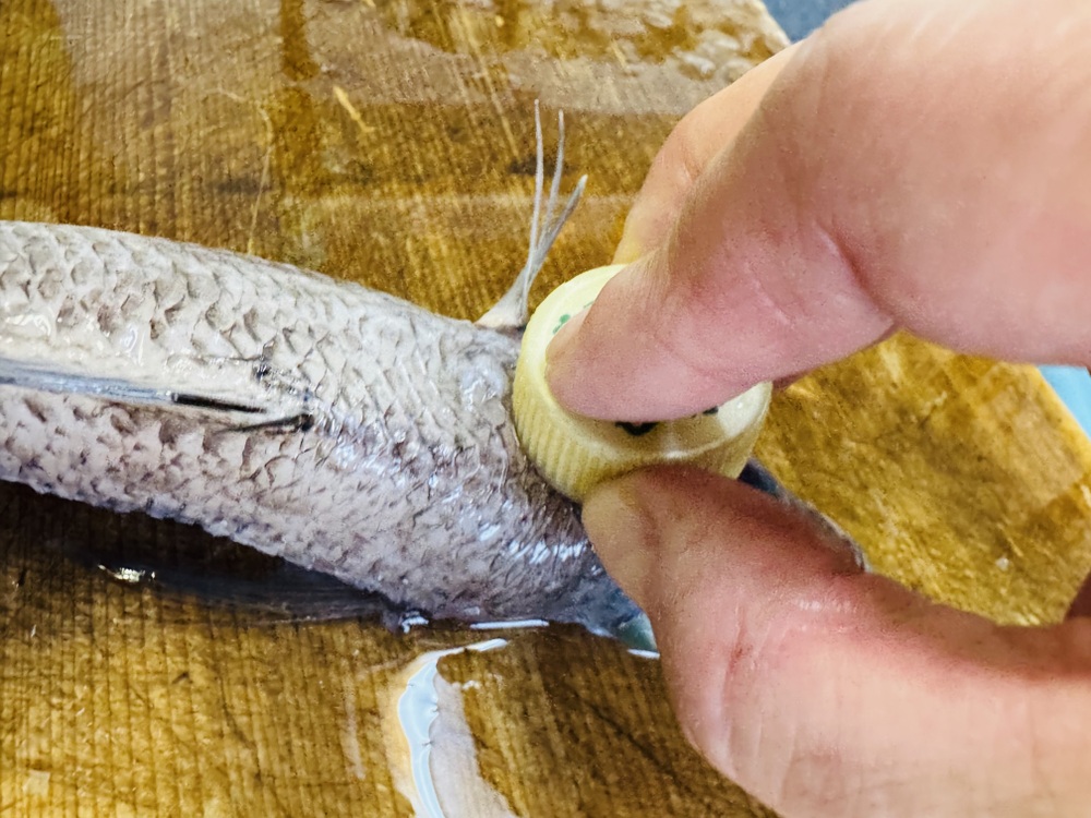 今まで包丁の反対側や鱗取りを使って作業していましたが、以前テレビでやっていたペットボトルの蓋活用で鱗取りをしました。