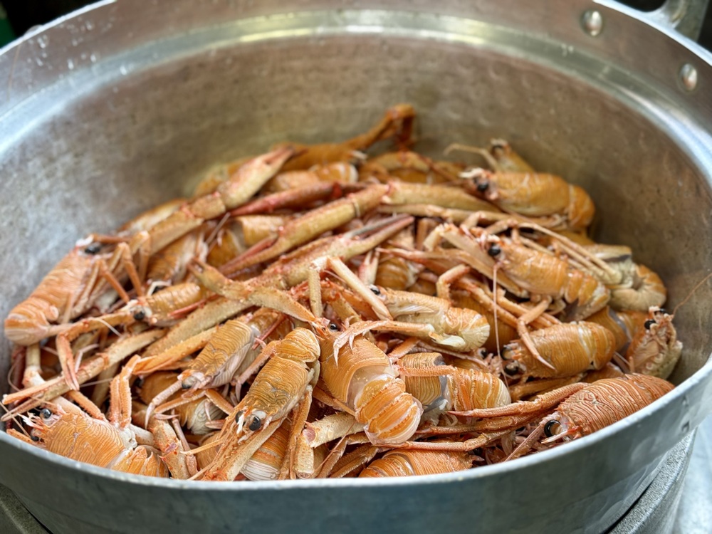 海水濃度だいたい5%の沸騰したお湯にガシャエビを入れて色が変わって3-4分でザルにあげます