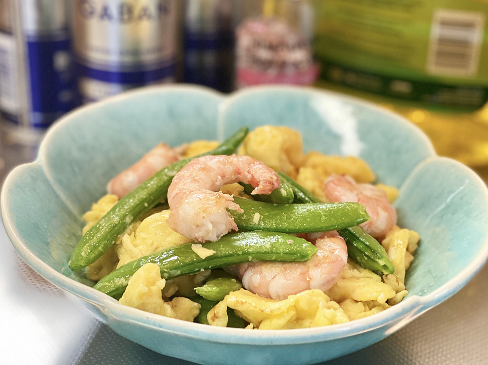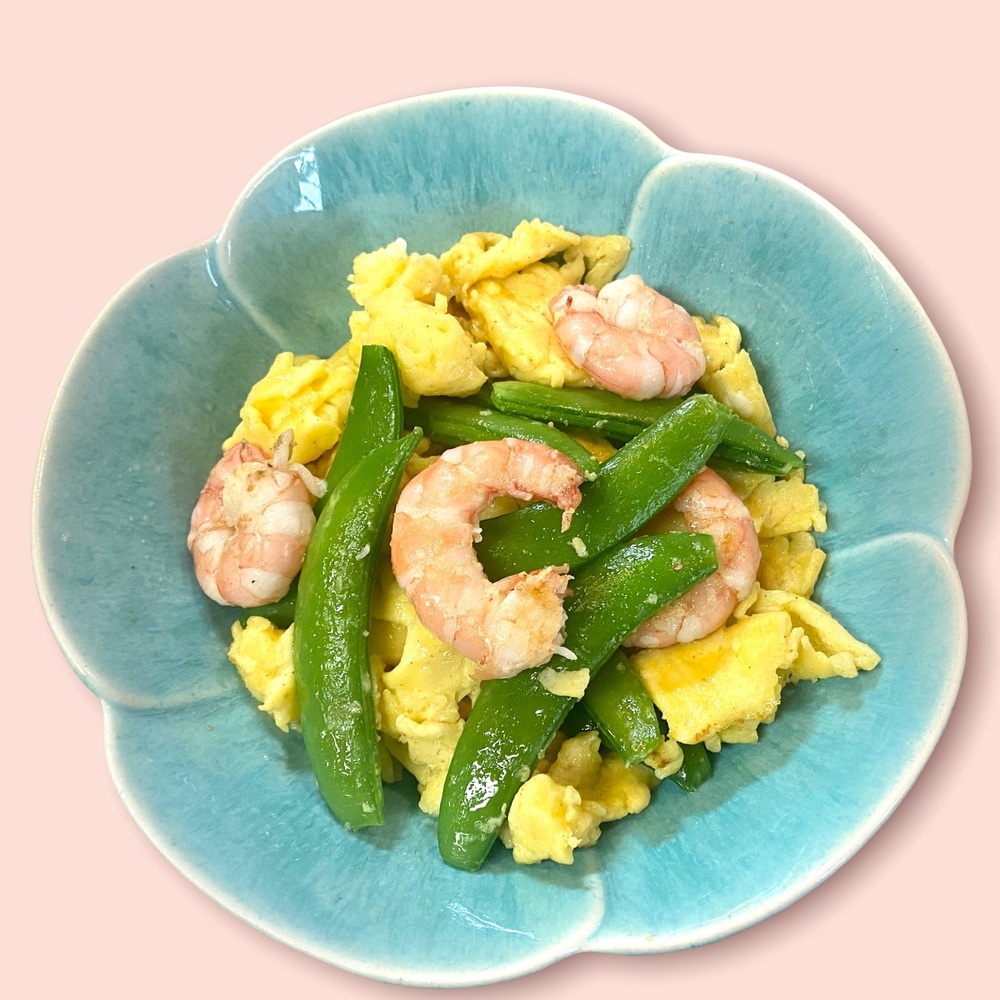 最後に茹でたスナップエンドウ・ふんわり炒り卵・プリっトロえびを一緒に炒めて味付けを整えて完成❣️