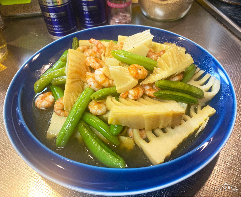 筍・スナップエンドウ(下茹でしてありません)をケンコーのガーリックバターソースで炒め、サラッと出汁つゆの素をたらして、トロエビと合わせて炒めるだけ。