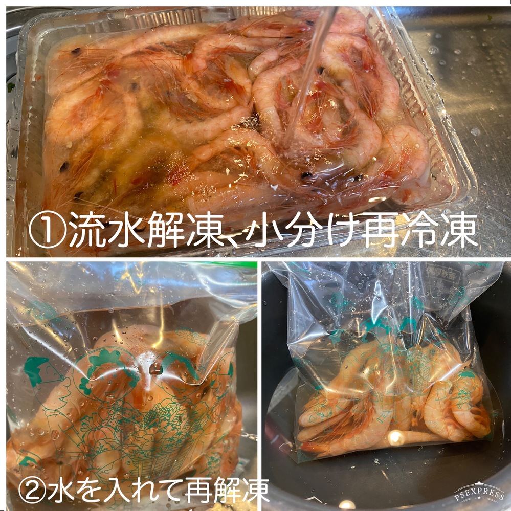 その他、頭だけを取り除いての再冷凍も可能ですが、むき海老にして再冷凍しますとトロえびの旨味が損なわれますので、ご注意を!(🚫オススメいたしません)