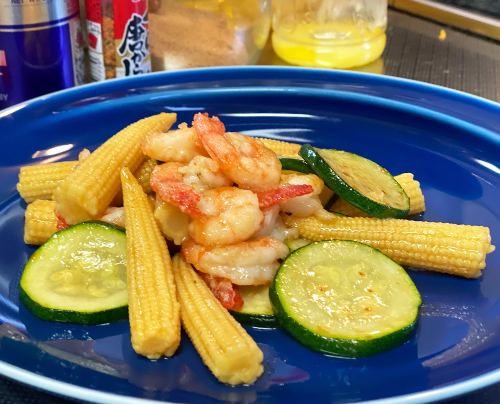 大好きなヤングコーンとズッキーニをトロえびと一緒にバター醤油炒めにしました。