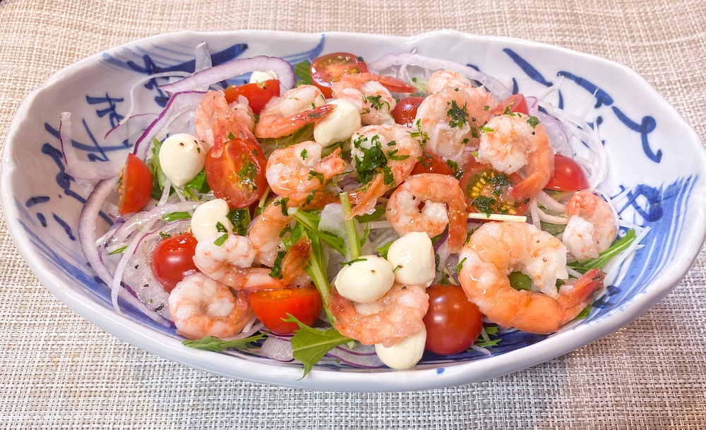 刻んだ野菜(水菜と紫玉ねぎ)、いただきもののミニトマトとモッツラレアチーズ、トロえびを和えたサラダです🥗