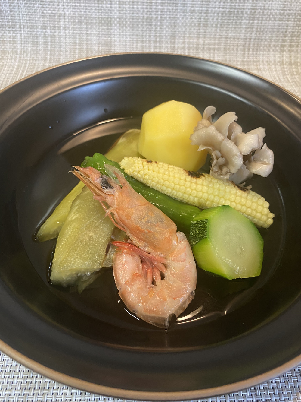 本だしに御塩とみりんで味を整えて、3時間ほど漬けて完成。2.3日はぬか床のように漬けて食べる事もできる。トロえびの旨味が夏野菜と絡み合って美味しい一品💙