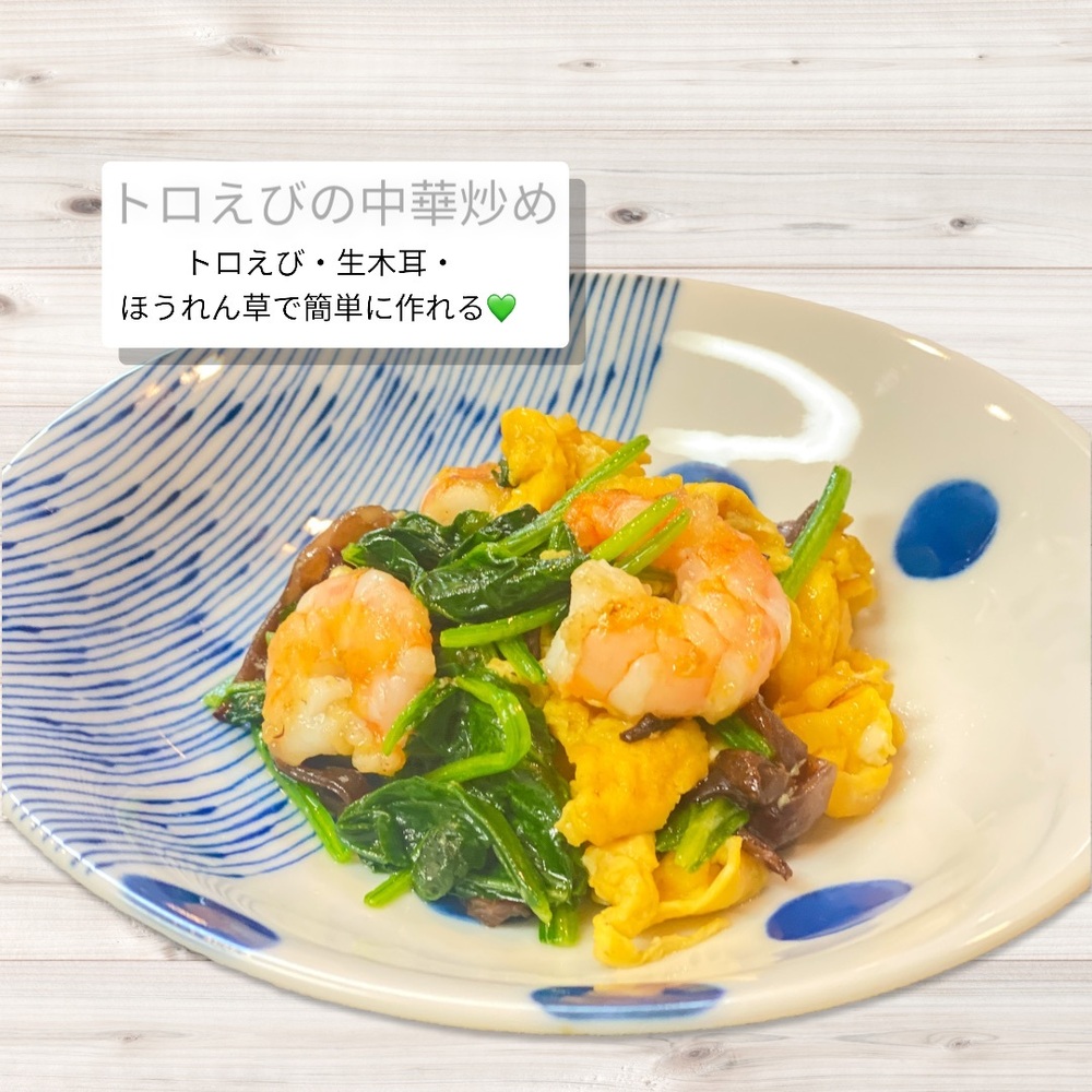 ごま油でキクラゲを炒めた後、ほうれん草・トロえび・炒り卵をサッと炒めて、白だしで味付け。