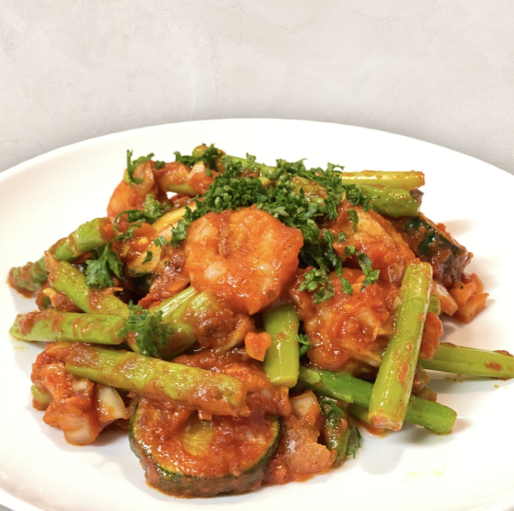 今回はトロえび・ズッキーニ・アスパラで作るピリ辛トマトソース炒め🦐