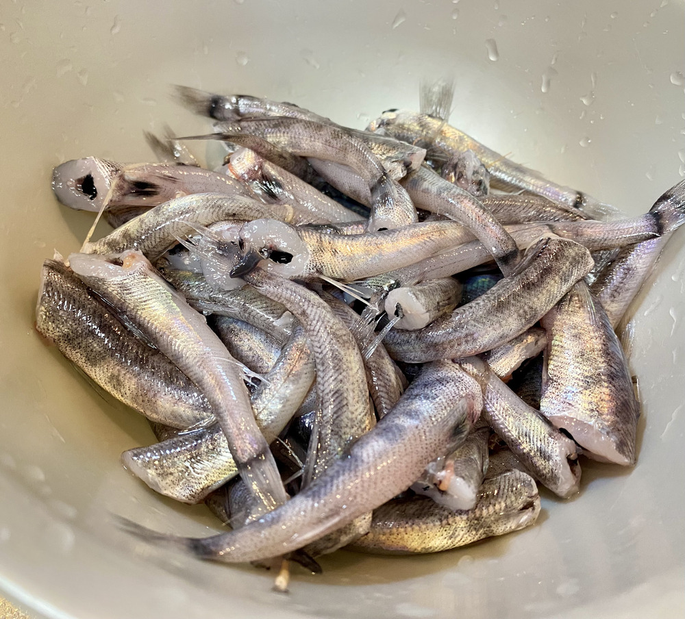今回はそのメヒカリを唐揚げにしました。サイズは中小」サイズ。慣れないと手間かと思いますが、キッチンバサミを活用すると簡単!(頭がついていても美味しいですが、私は取り除きます)
