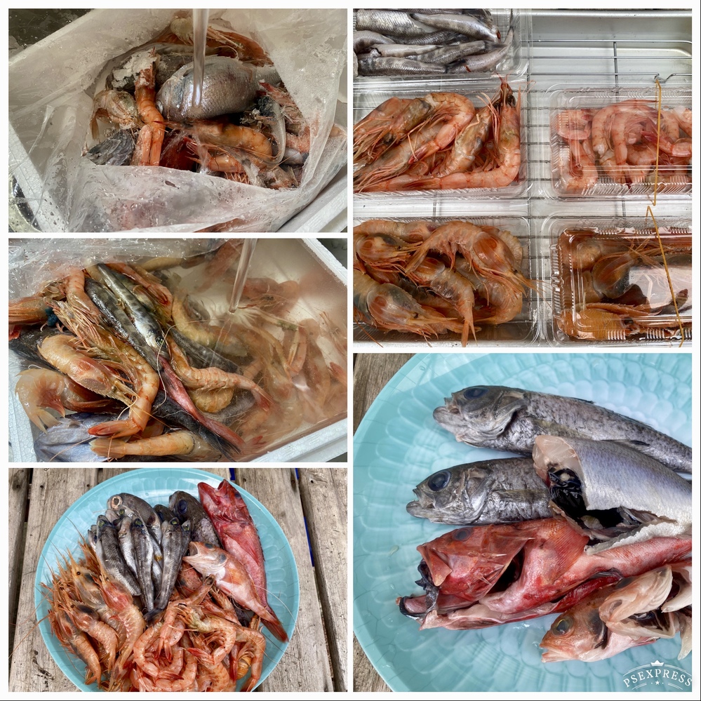 (わかりやすくパックに並べましたが袋で十分です。使わないものは水を切らず冷凍庫で保管。下処理やえびなど頭を取っておくと便利です。ちなみに家庭用冷凍庫での保管は1ヶ月くらいはお刺身でも大丈夫です。)