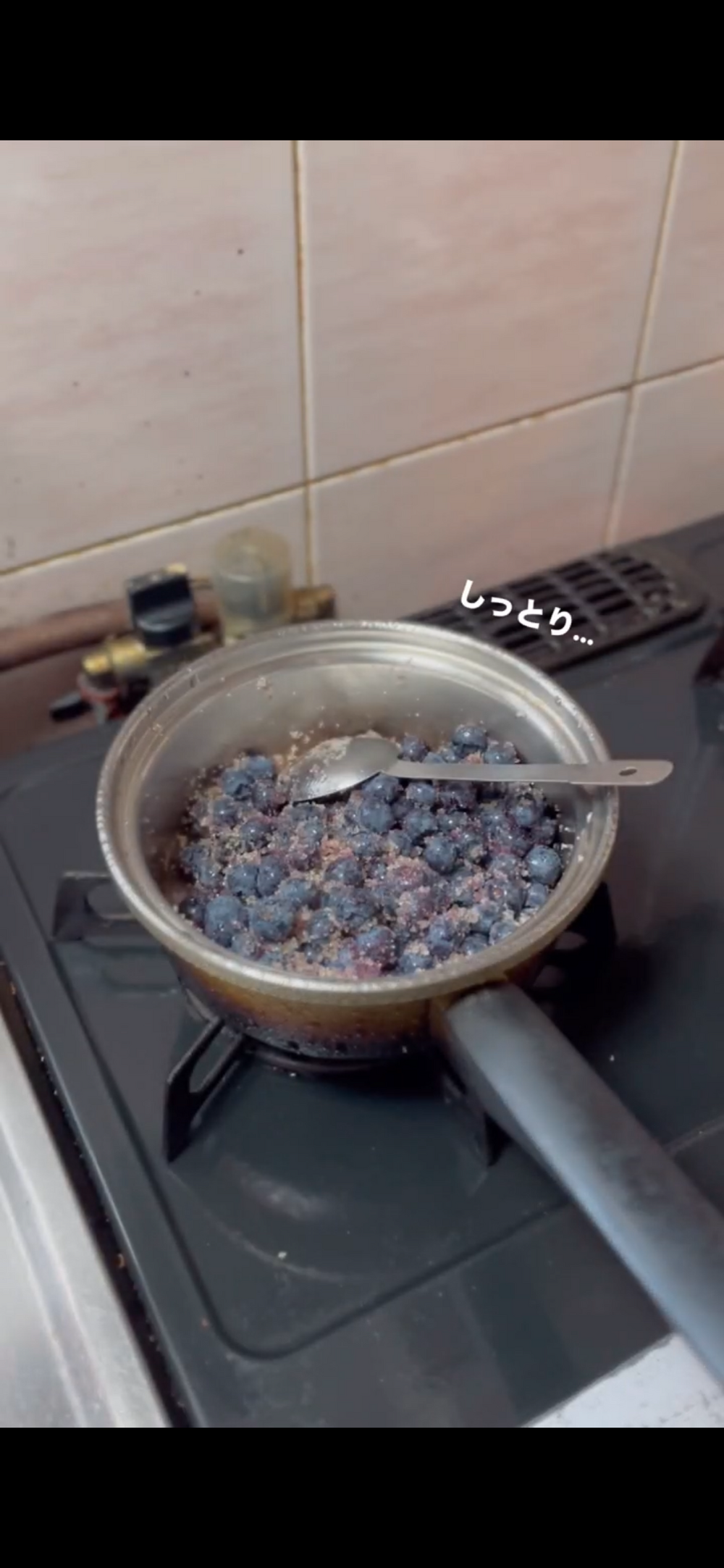 ・小鍋にブルーベリー200gと砂糖70gを入れて混ぜ、水分が出るまで1時間放置。