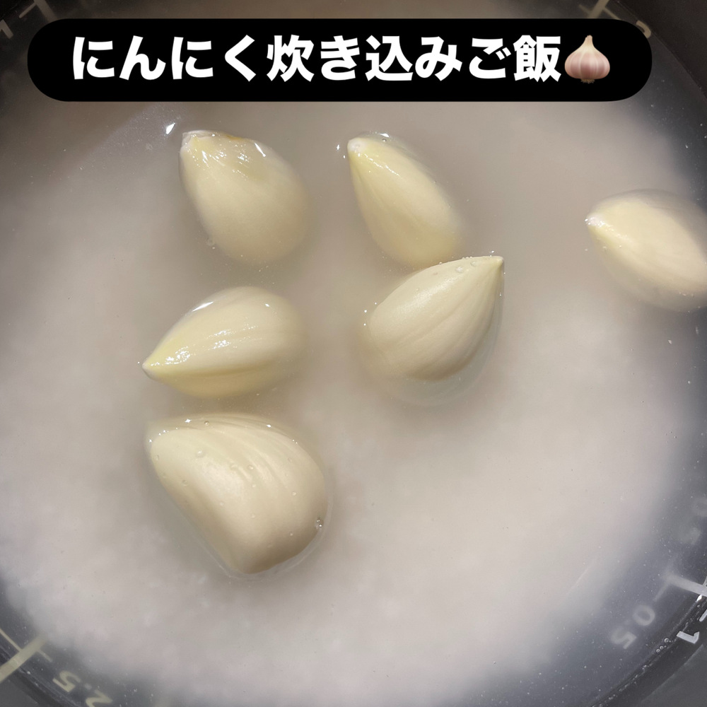 お米を研いでいつもの量の水を入れたら、皮をむいて根本をカットしたにんにくを丸ごと入れて、炊飯のスイッチオン✨