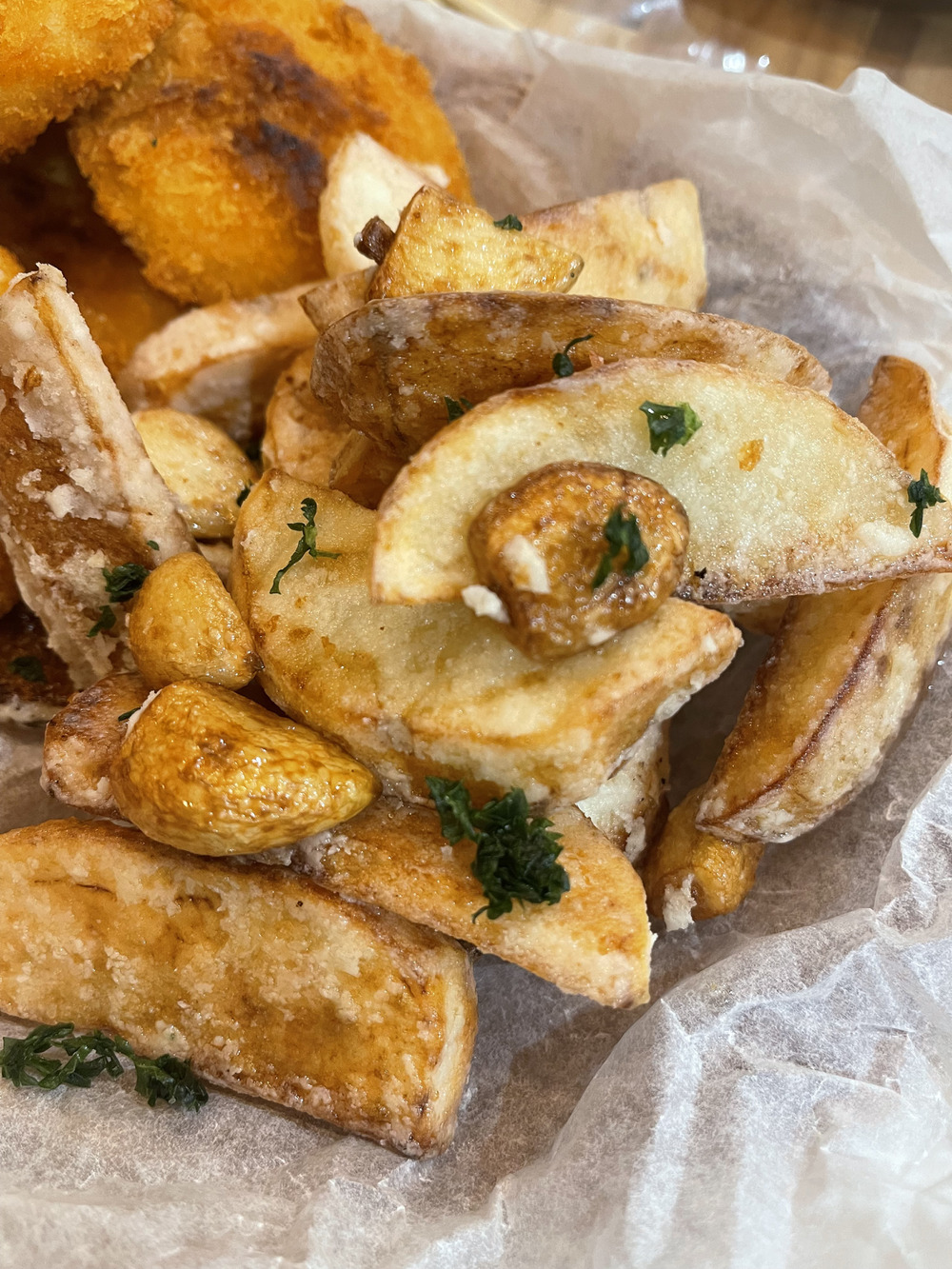 じゃがいもとにんにくを片栗粉でカリッと素揚げ。
