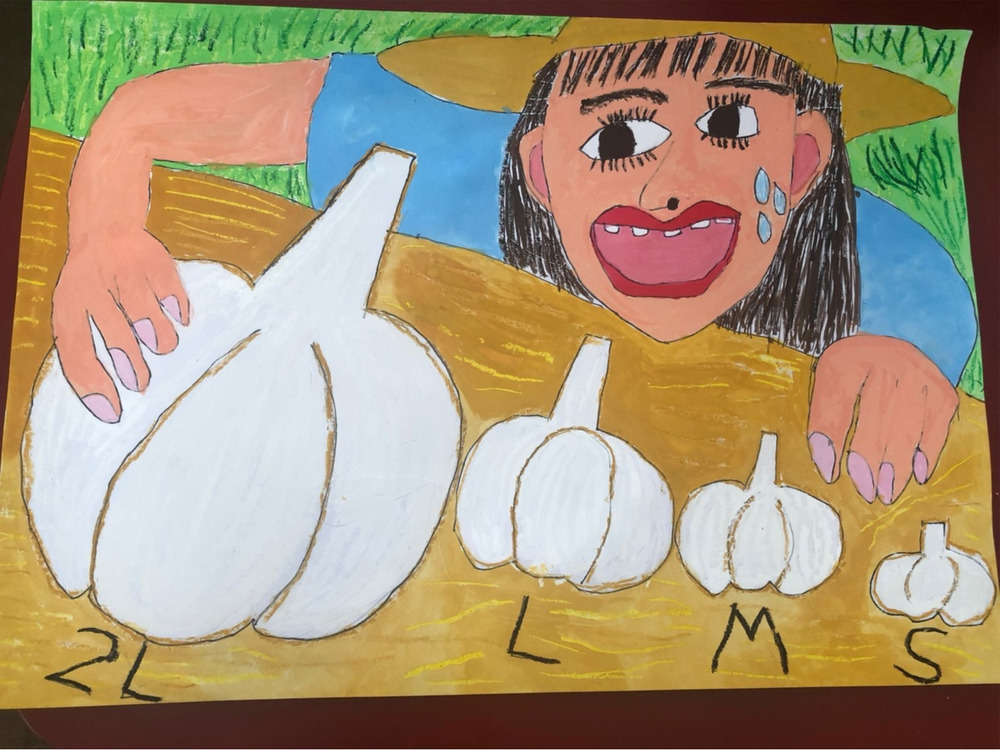 サイズ分けの作業の絵を描きたいと、にんにくを机に並べて観察しながら一生懸命描いていました(笑)