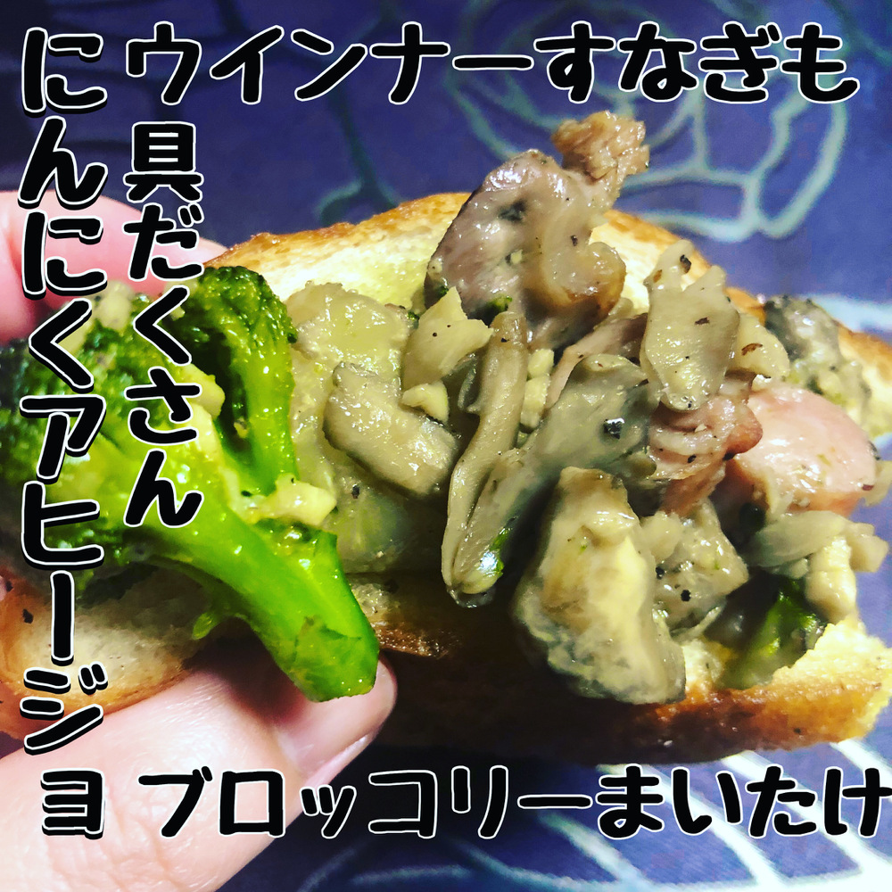 フライパンに、ウインナー、すなぎも、まいたけ、ブロッコリー、にんにく、オリーブオイル、塩こしょうを入れてグツグツ🥘
