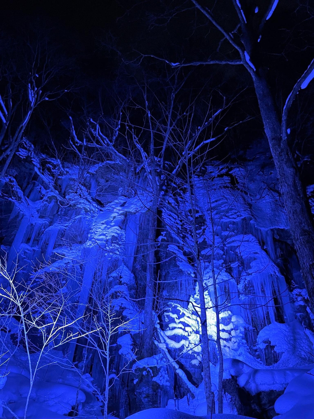 光に照らされているのは、氷の柱です。冬になると、極寒のため、渓谷の大きな滝が凍って、巨大なつららがそびえ立ち、圧巻です✨