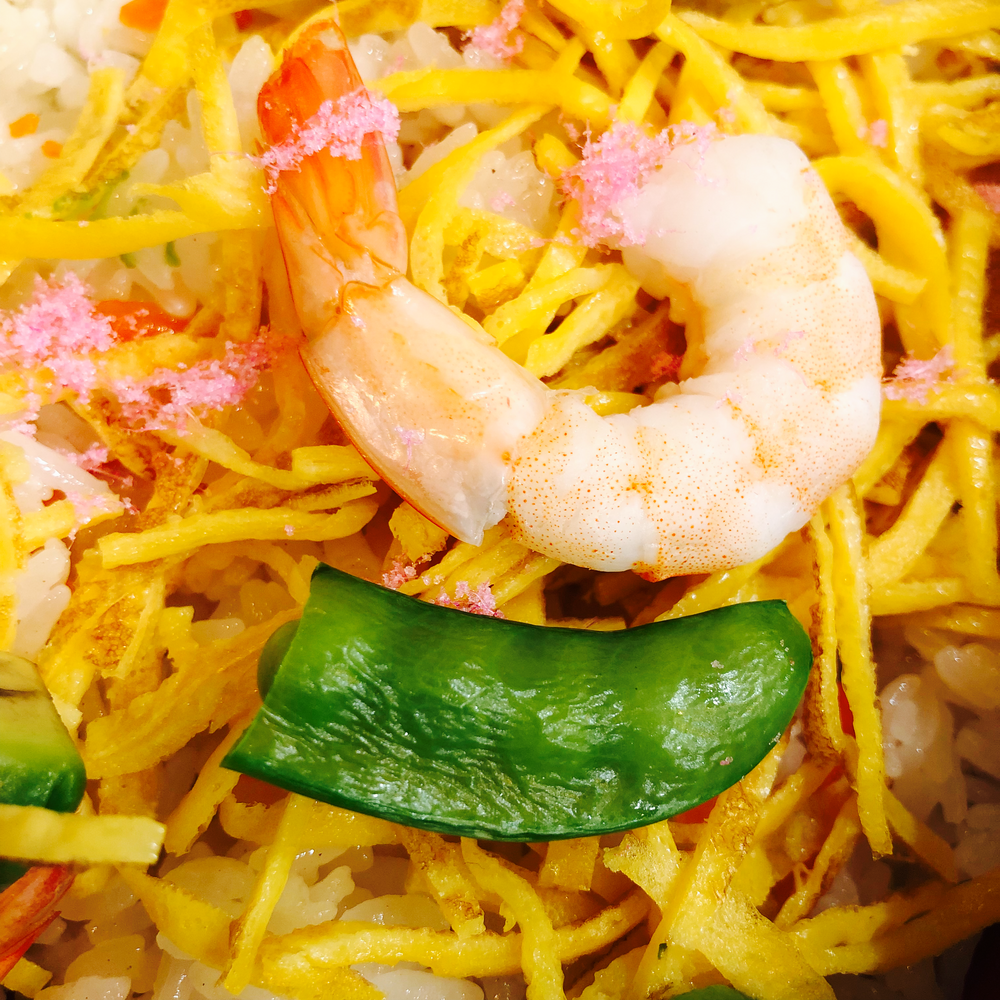 お雛様の前でみんなで、ちらし寿司をいただきました✨