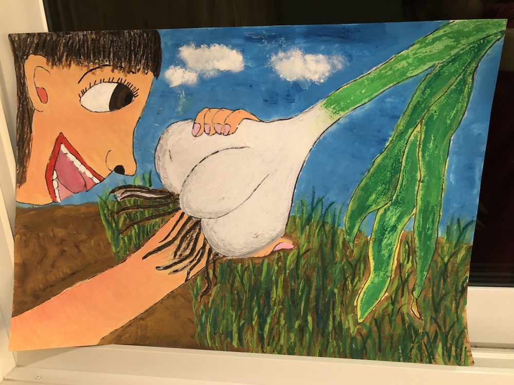 心がドキドキワクワクしたところを強調して描いてごらん❗️と言ったら、立派な根っこと肉厚なにんにくに力がこもったようです。子供の感性は素直で見てて楽しいです。