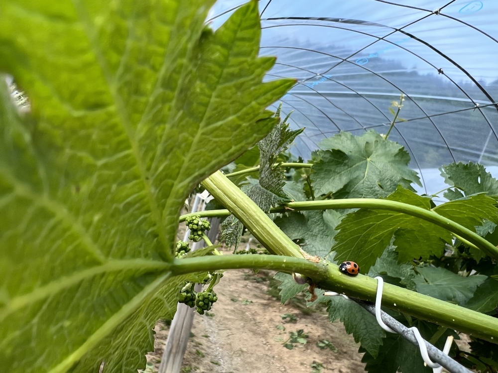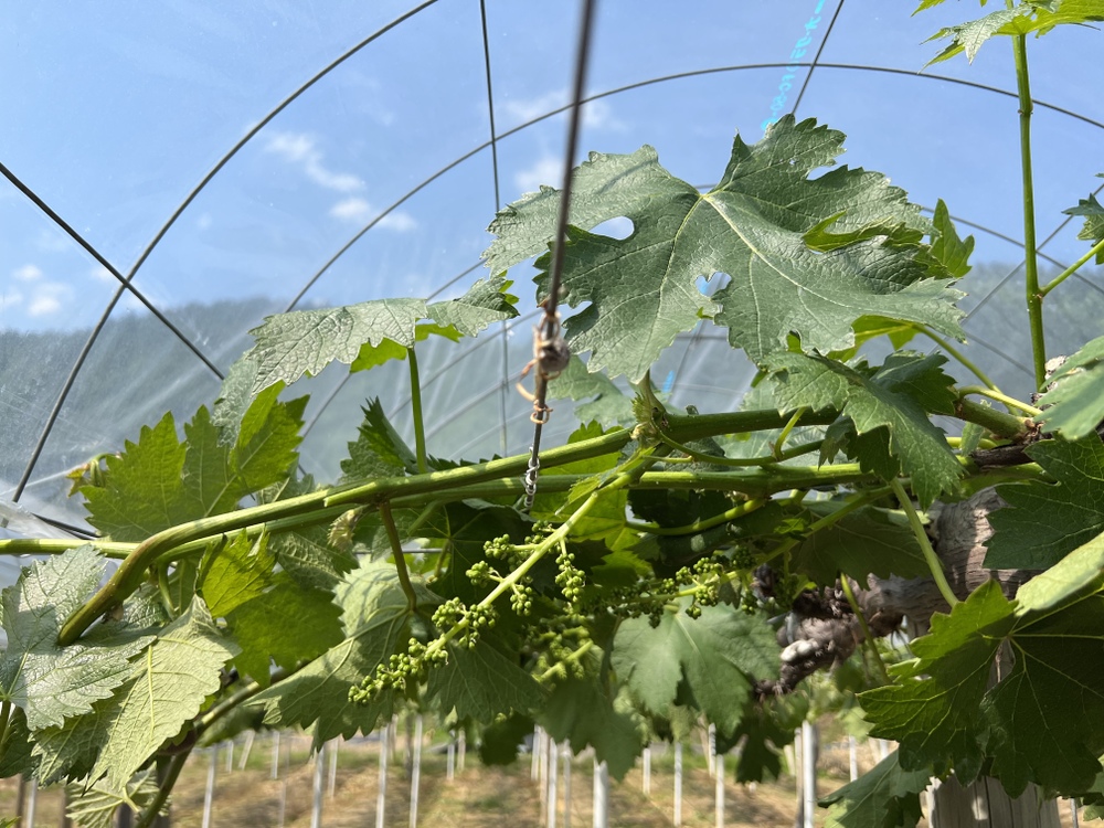 最近は露地のぶどうも少し大きくなってきたので一枝に実るぶどうを一房にする作業をしています。