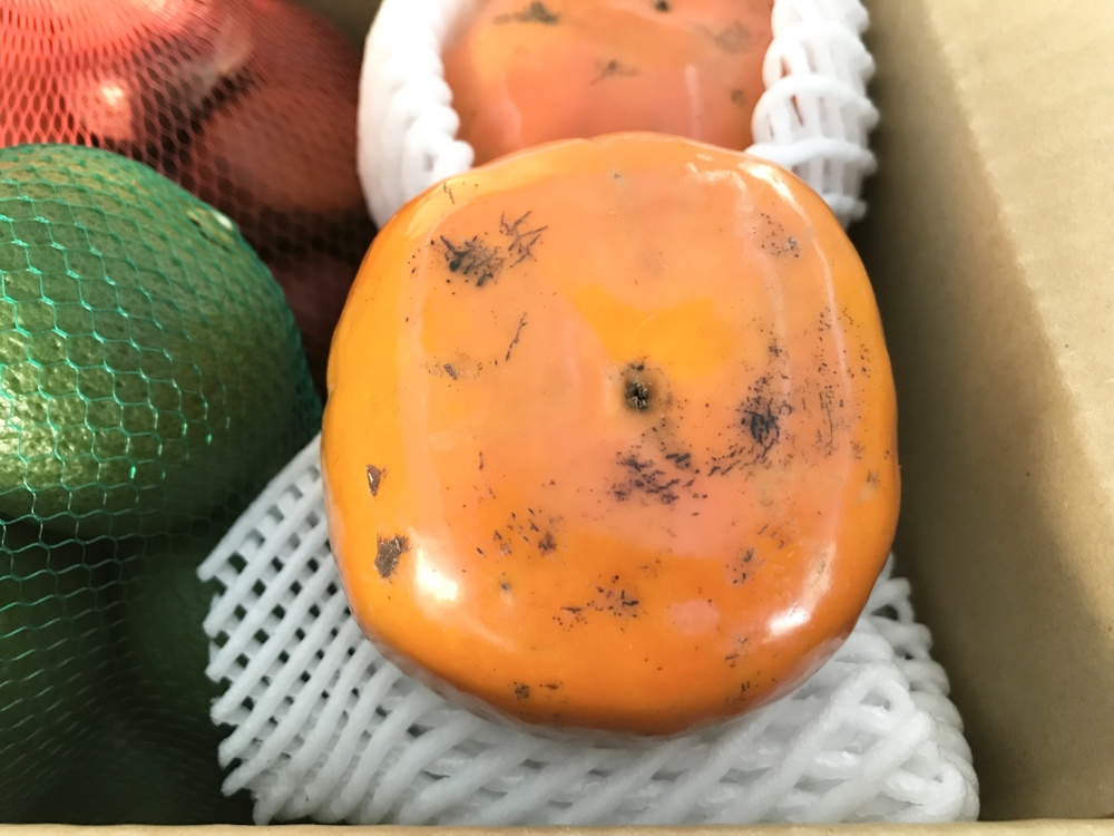 柿の収穫が始まりましたが、台風の影響から傷がついています。