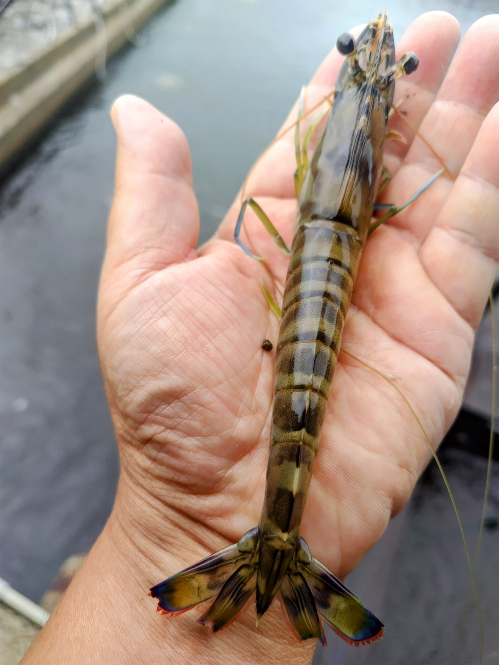 大きいものでは、約15センチの25gほどのものも見かけるようになりました。全体としては、まだこれからですが、このまま順調に育てば昨年並みに良い車海老に育ちそうです。