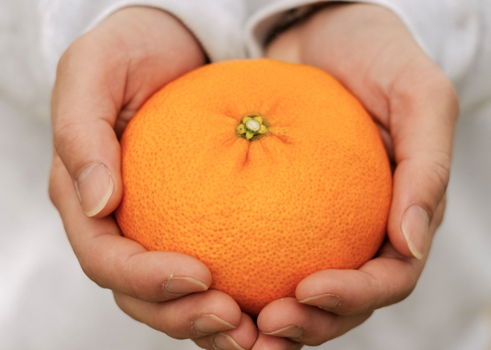 愛媛が誇る柑橘の傑作「甘平(かんぺい)」。その最大の特徴は、薄皮の中にぎっしりと詰まった、驚くほど大きな果肉の粒にあります。一口食べれば、粒が「シャキッ」と心地よく弾け、中から濃厚でガツンとくる甘みが溢れ出します。