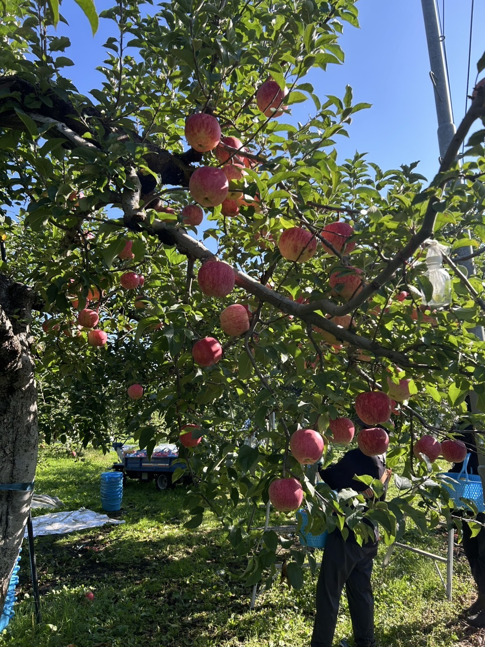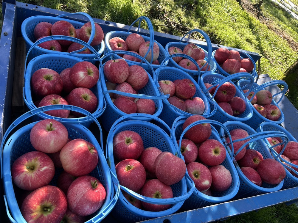 今日の園地の朝の気温は12℃、寒い中の収穫でりんごが朝露で水滴だらけでした。