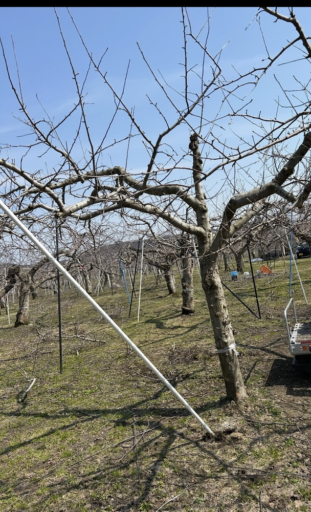 葉のないこの時期の木は少し寂しく見えますが、実はここがとても大事なタイミング。どの枝を残すかで、今年のりんごの出来が決まります。