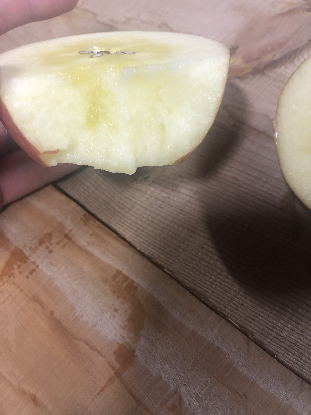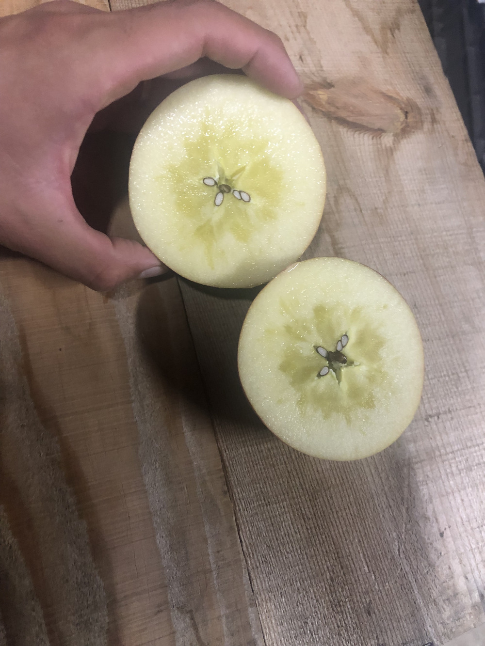 今日収穫した葉取らずふじ、おやつがてらにどのくらい蜜がはいっているのか。