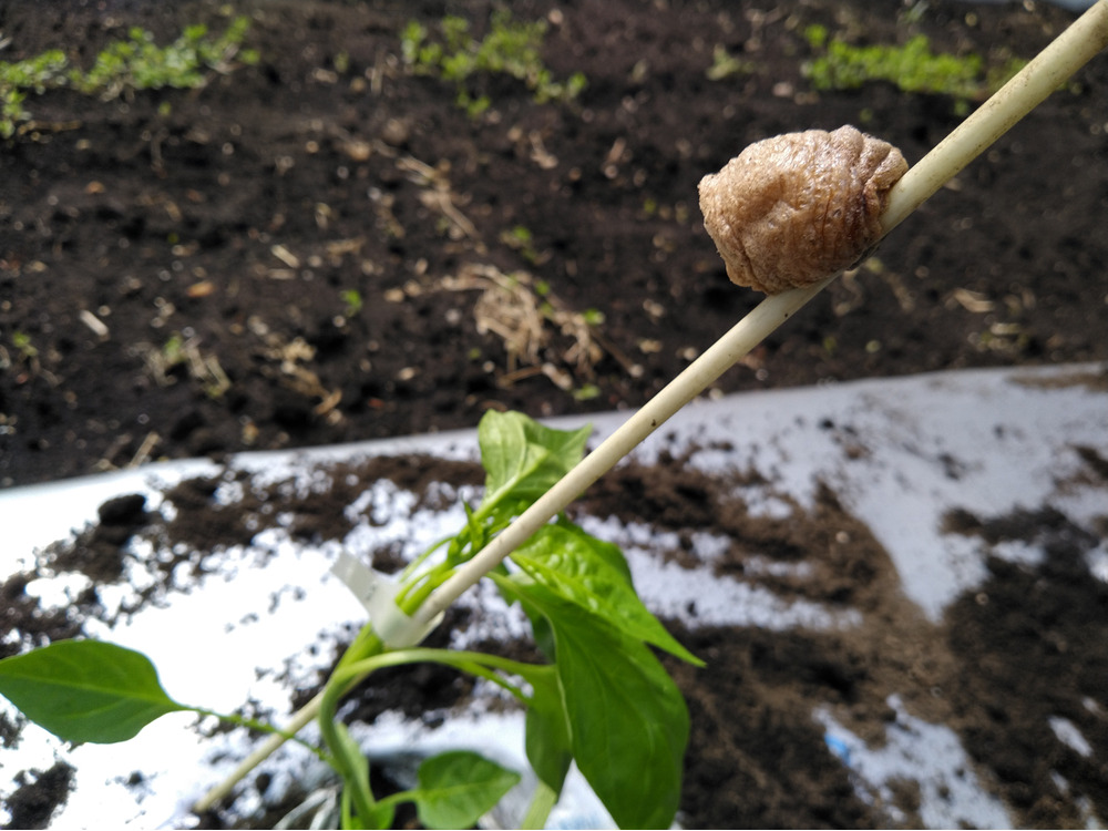 うちでは農薬を減らすために、生物多様性を意識して益虫が居つきやすいような環境づくりを行なっております。それが功を奏してテントウムシが早くから働いてくれてアブラムシとのバランスをとってくれているとしたら嬉しい限りです。テントウムシがピーマン苗の近くに散見されるのでそうであってほしいですね。