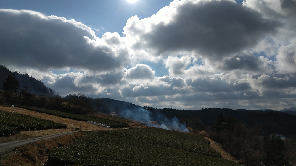 土岐茶園では現在、改植作業を進めています。改植とは、古いチャの木を、新しい物に更新する作業です。写真は、伐根したチャの木を燃やしている所です。現在作業中の場所には、奈良県の品種「大和みどり」を植える予定です。